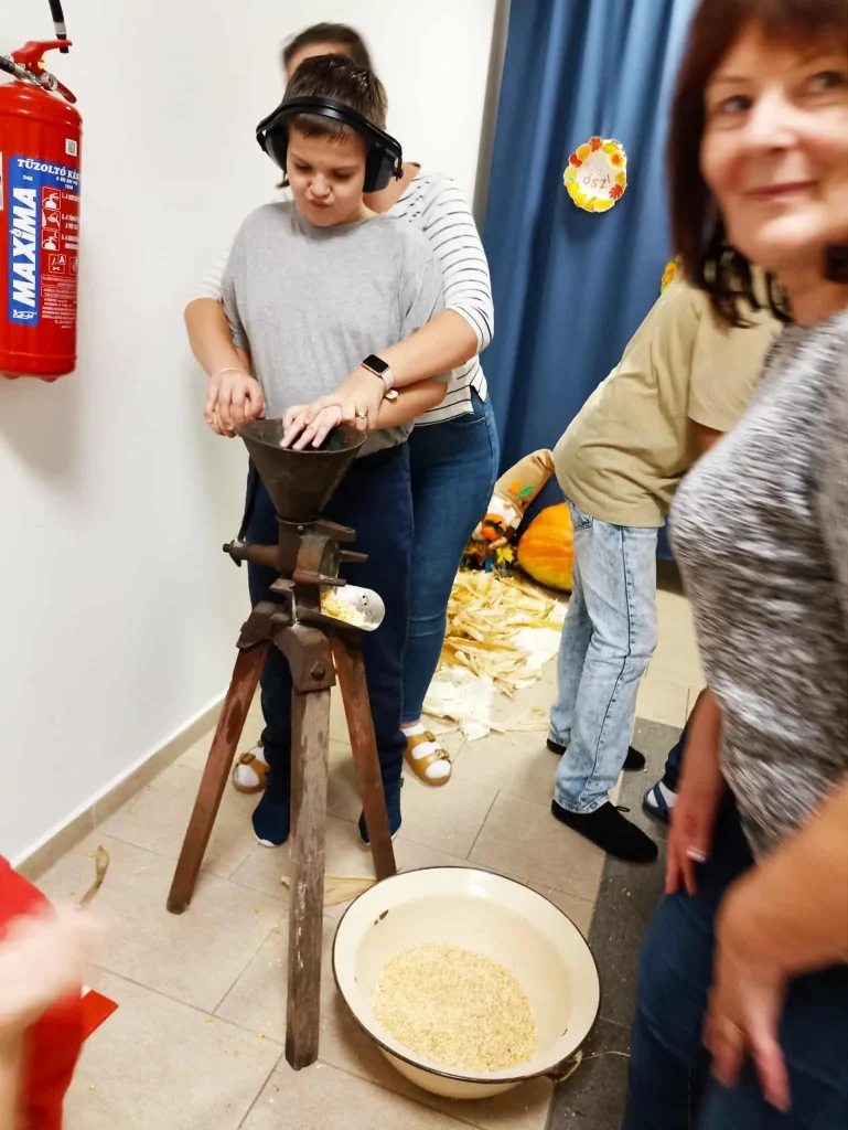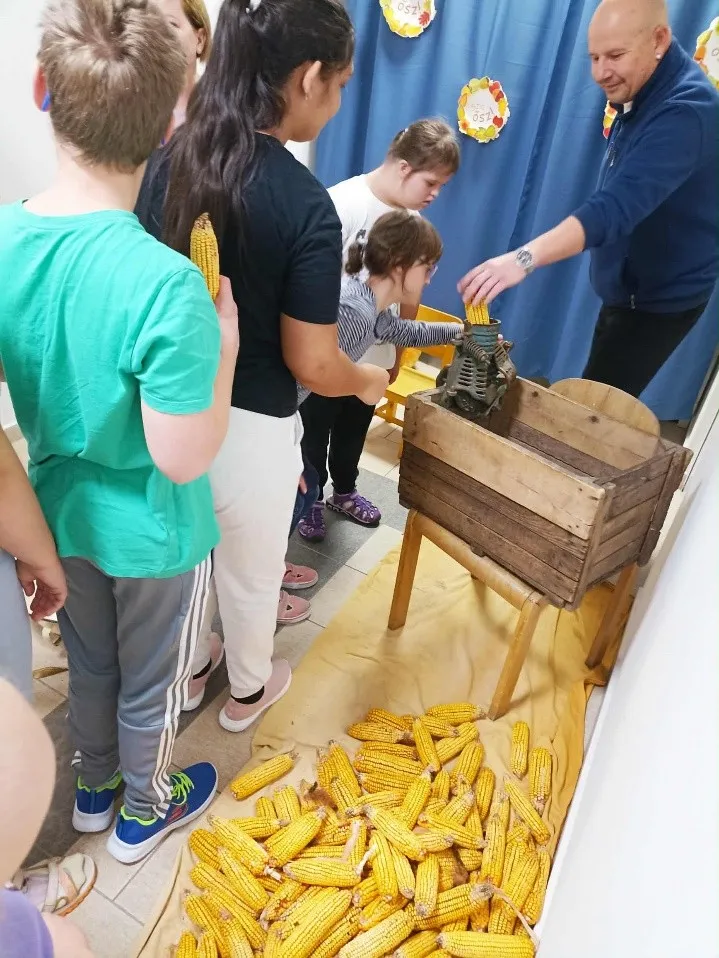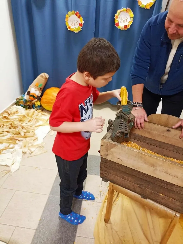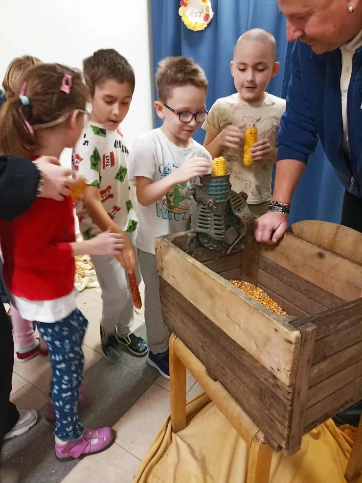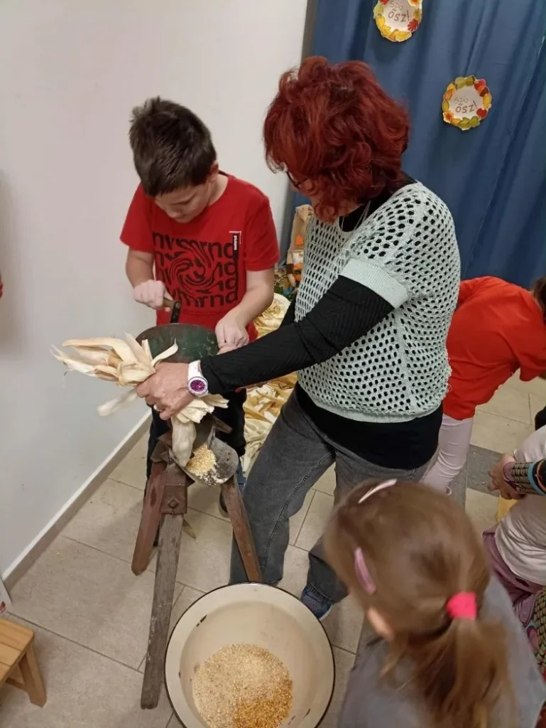 Ez az őszi múltidéző foglalkozás lehetőséget biztosított arra, hogy megismerkedhettek a kukorica morzsolásával, darálásával, és mindkét eszközt kipróbálhatták diákjaink. Régen nem veszett kárba a kukorica csutkája, és csuhélevele sem, ebből csuhébabát, és virágdekorációt készítettek. Érdeklődve, kíváncsian várták a lehetőséget, hogy sorra kerüljenek minden tevékenység kipróbálására. A program során a hangulatot, népi zene hallgatásával tették még emlékezetesebbé a hagyományőrző egyesület tagjai. Köszönet érte.