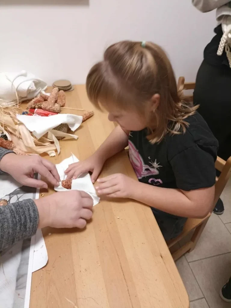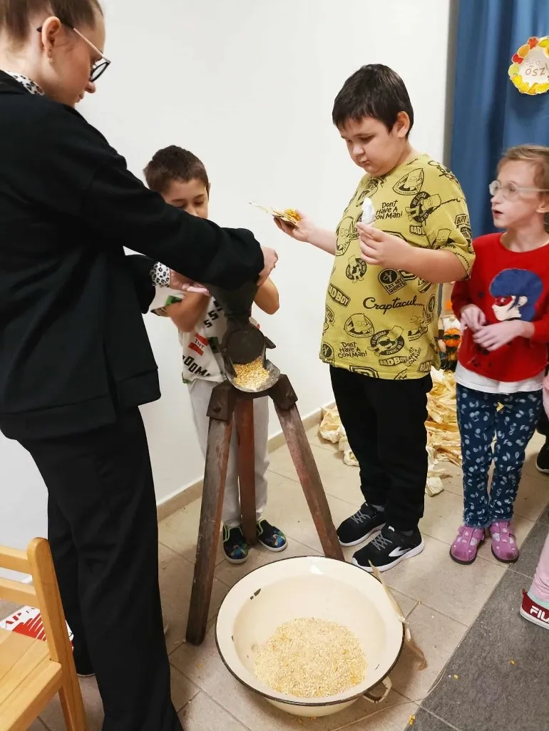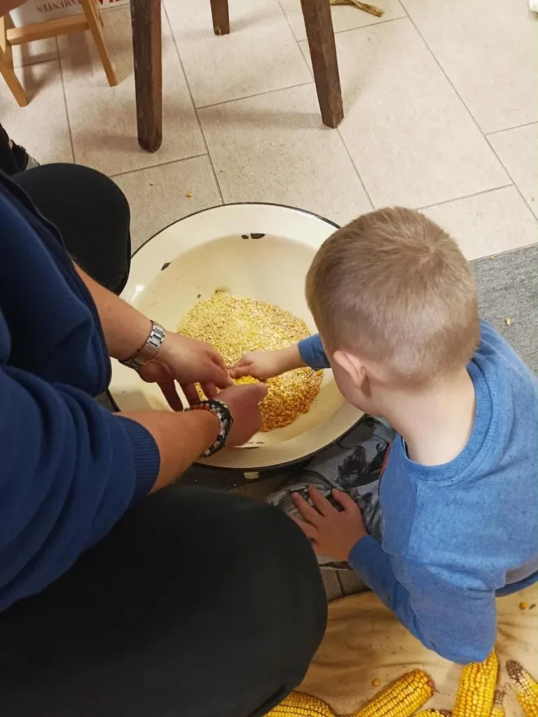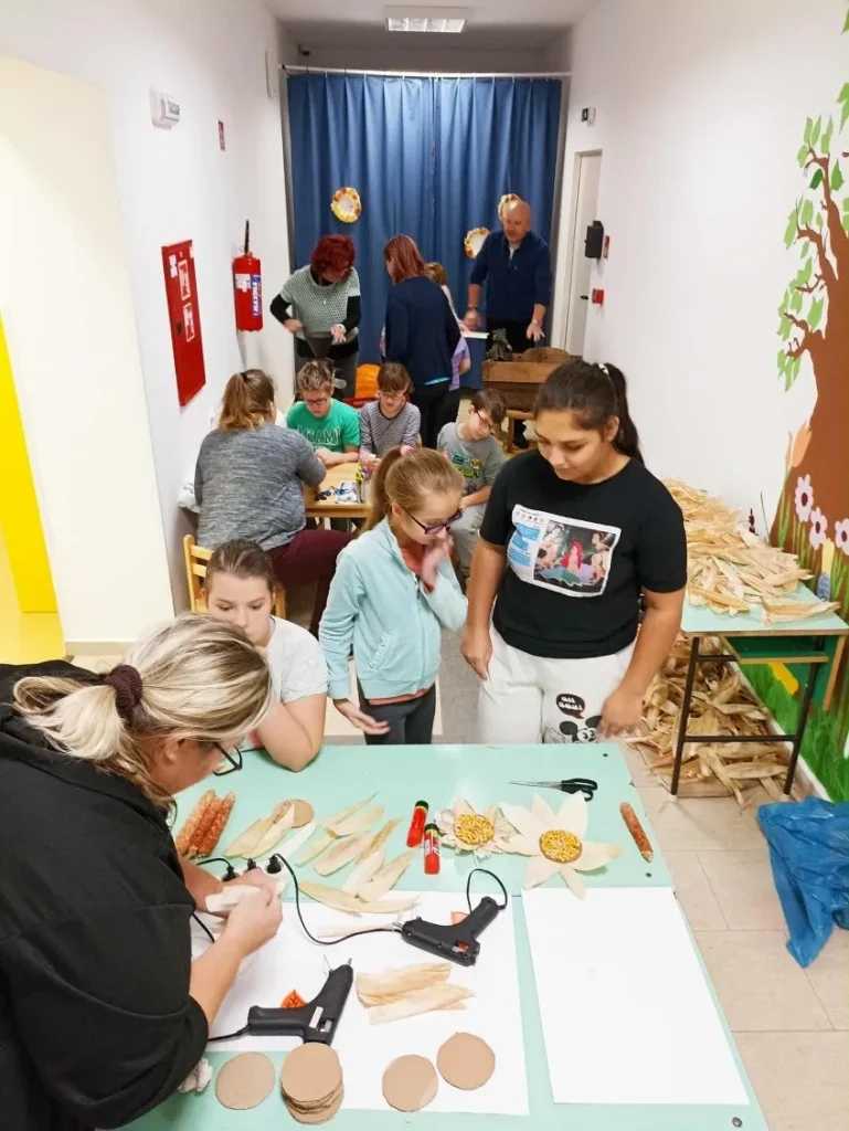 Ez az őszi múltidéző foglalkozás lehetőséget biztosított arra, hogy megismerkedhettek a kukorica morzsolásával, darálásával, és mindkét eszközt kipróbálhatták diákjaink. Régen nem veszett kárba a kukorica csutkája, és csuhélevele sem, ebből csuhébabát, és virágdekorációt készítettek. Érdeklődve, kíváncsian várták a lehetőséget, hogy sorra kerüljenek minden tevékenység kipróbálására. A program során a hangulatot, népi zene hallgatásával tették még emlékezetesebbé a hagyományőrző egyesület tagjai. Köszönet érte.