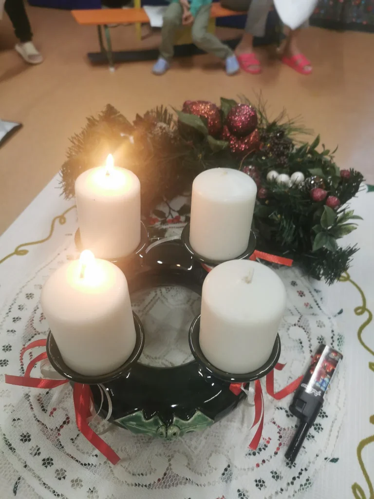 Az adventi időszakban intézményünk közössége minden héten összegyűlt a tornateremben, ahol közösen gyújtottuk meg az adventi koszorú gyertyáit. Ezek az alkalmak lehetőséget teremtettek a megállásra, az elcsendesedésre és a közös várakozás megélésére a mindennapok rohanásában. A gyertyagyújtások nemcsak a karácsony közeledtét jelezték, hanem erősítették az összetartozás érzését is: gyermekek, fiatalok és pedagógusok együtt készültek az ünnepre. A közös énekek, gondolatok és imádságok segítettek abban, hogy az advent valóban a belső ráhangolódás, a figyelem és a reménység időszaka legyen közösségünk számára.