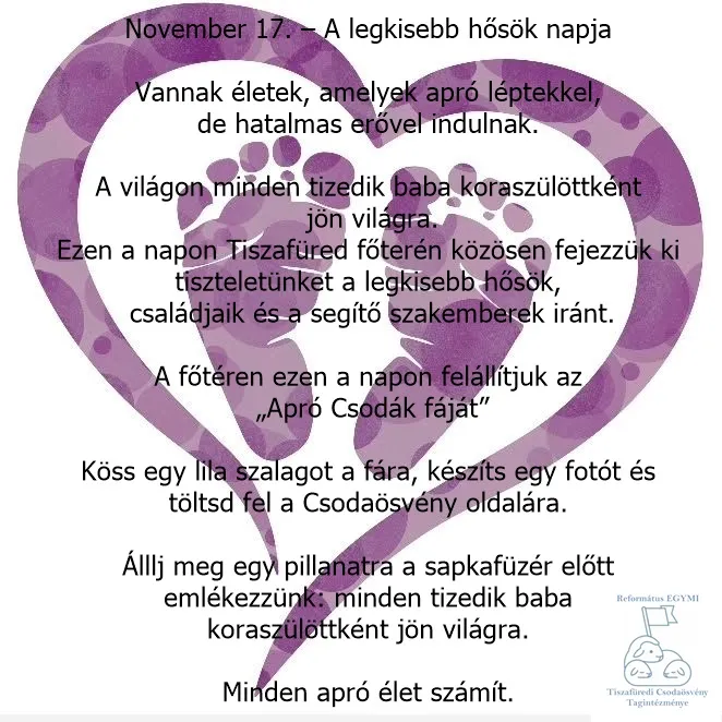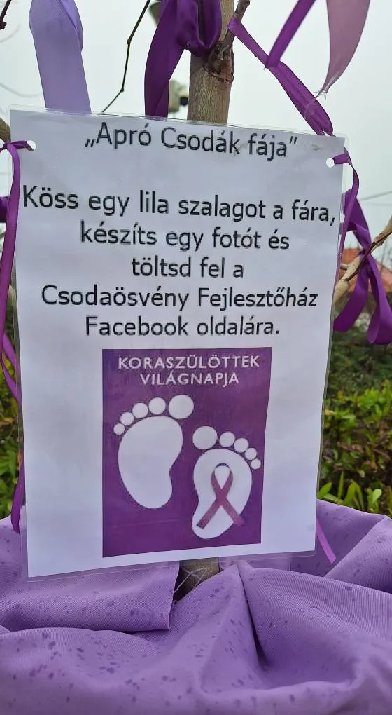 A Koraszülöttek Világnapja ezen a napon Tiszafüred főterén fejeztük ki tiszteletünket a legkisebb hősök, családtagjaik és a segítő szakemberek iránt. A főtéren felállítottuk az „Apró csodák fáját”, amelyre az érintettek, a velük együtt érzők lila szalagokat köthettek, ezzel is kifejezve támogatásukat és együttérzésüket a koraszülött családokkal.