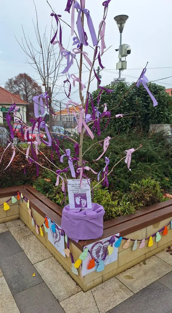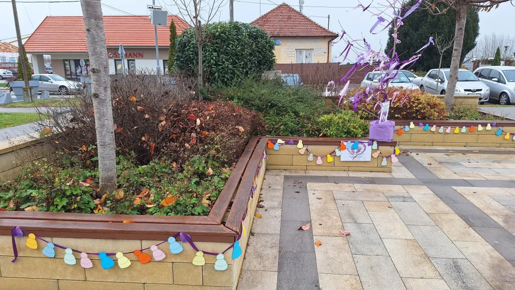 Készítettünk továbbá egy sapkafüzért melyen minden 10. sapka apró, lila volt ez szimbolizálta azt a fontos tényt, hogy minden tizedik baba koraszülöttként érkezik a világra. A látványos füzér és a fa dekorációja nemcsak figyelemfelkeltő lett a főtéren, hanem egyben emlékeztető is mindenki számára: az apró csodák értékesek.