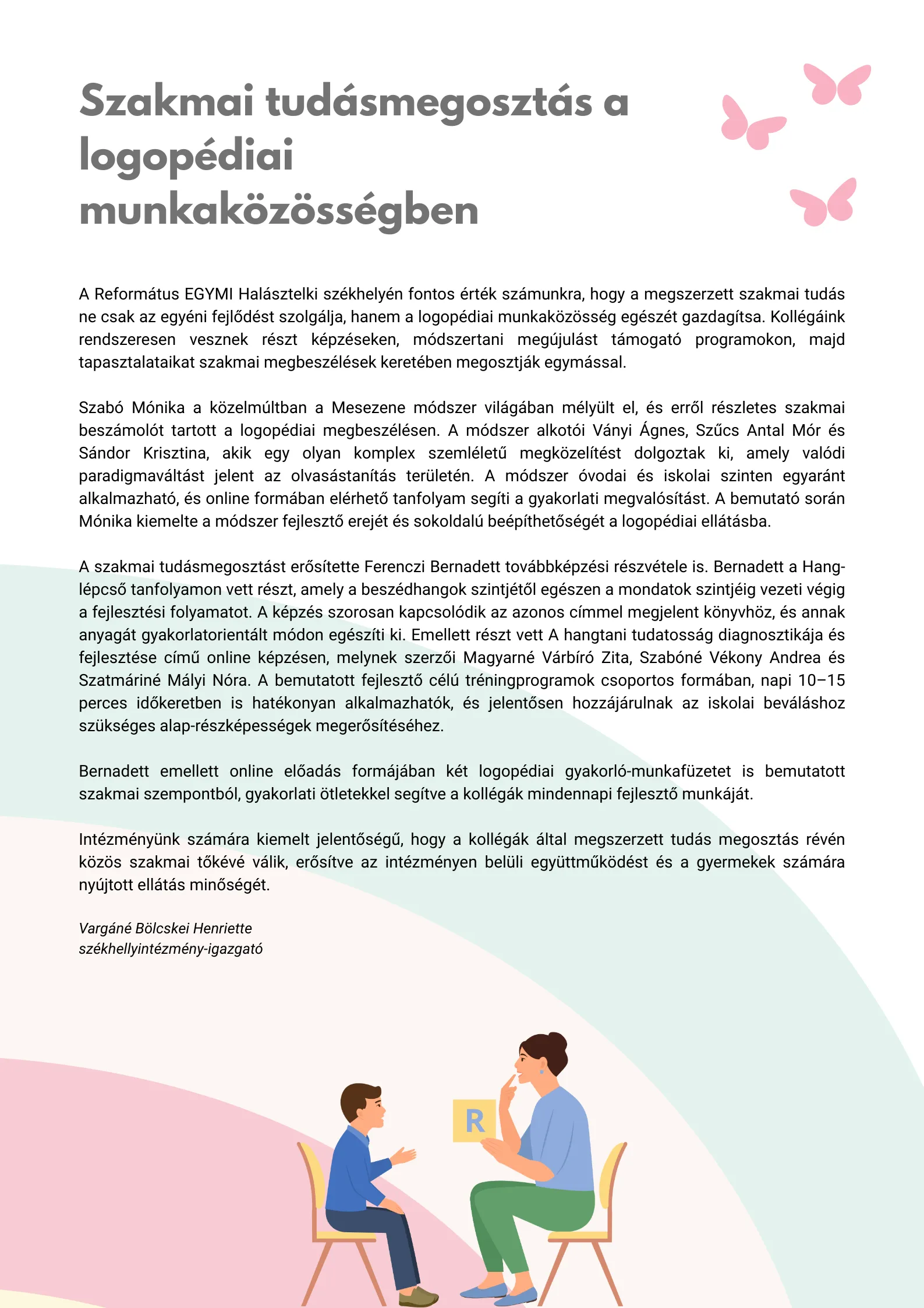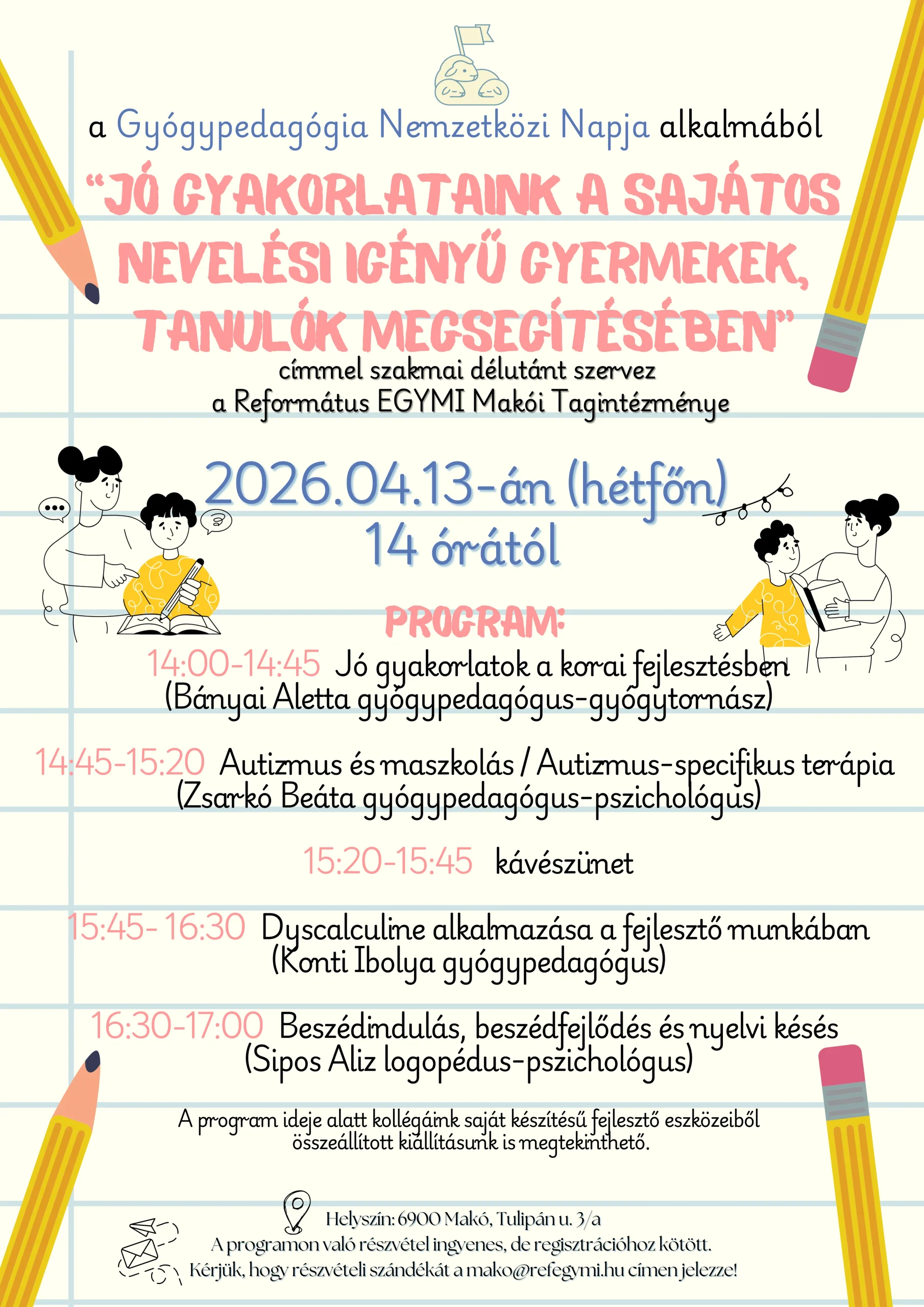 2026.04.13-án, hétfőn a Gyógypedagógia Nemzetközi Napja alkalmából szakmai délutánt szervezünk Tagintézményünkben, valamint két partnerintézményünkben (Szentes és Orosháza) is. Előadásainkat, bemutatóinkat a „Jó gyakorlataink a sajátos nevelési igényű gyermekek, tanulók megsegítésében” téma köré terveztük, melyre szakembereket és érdeklődő